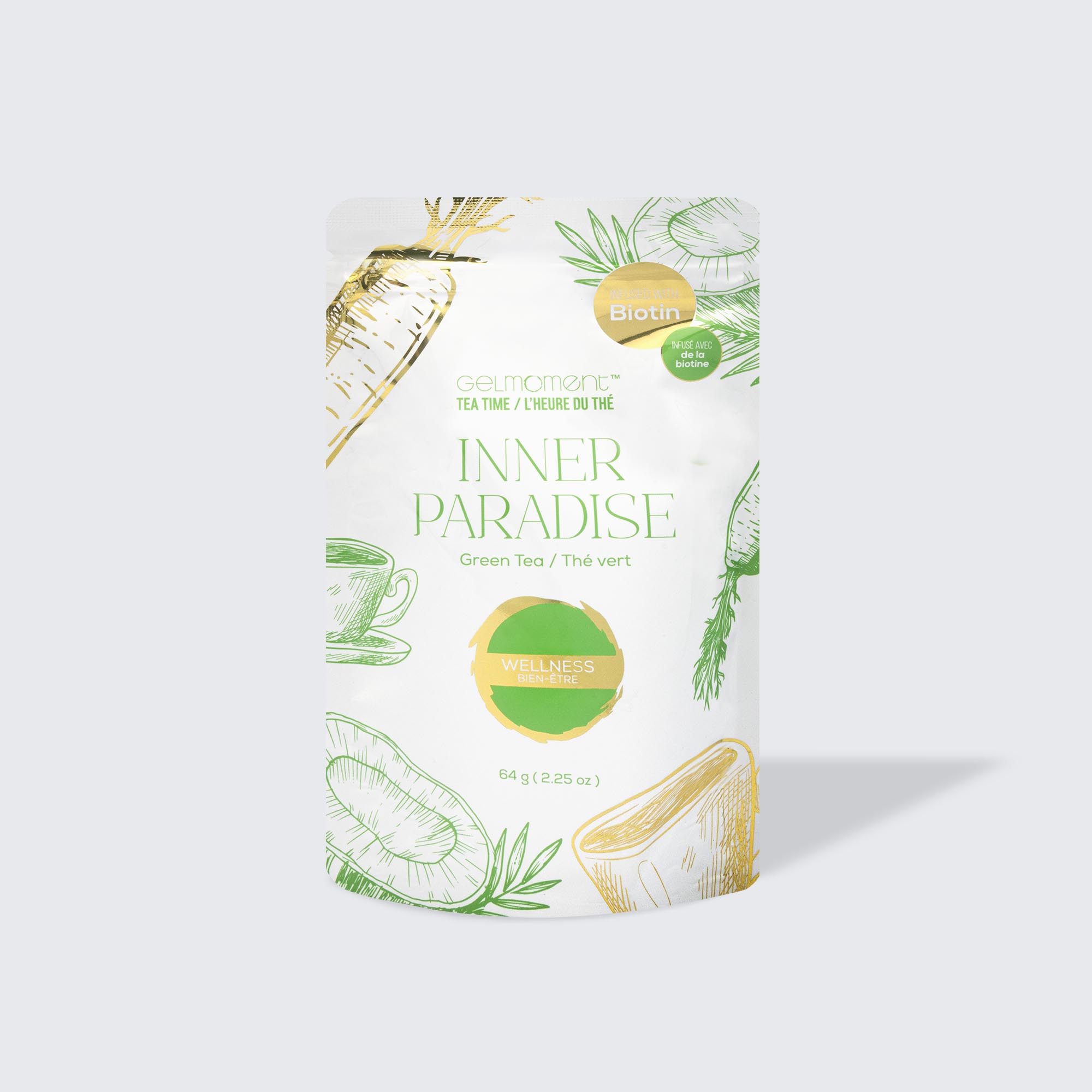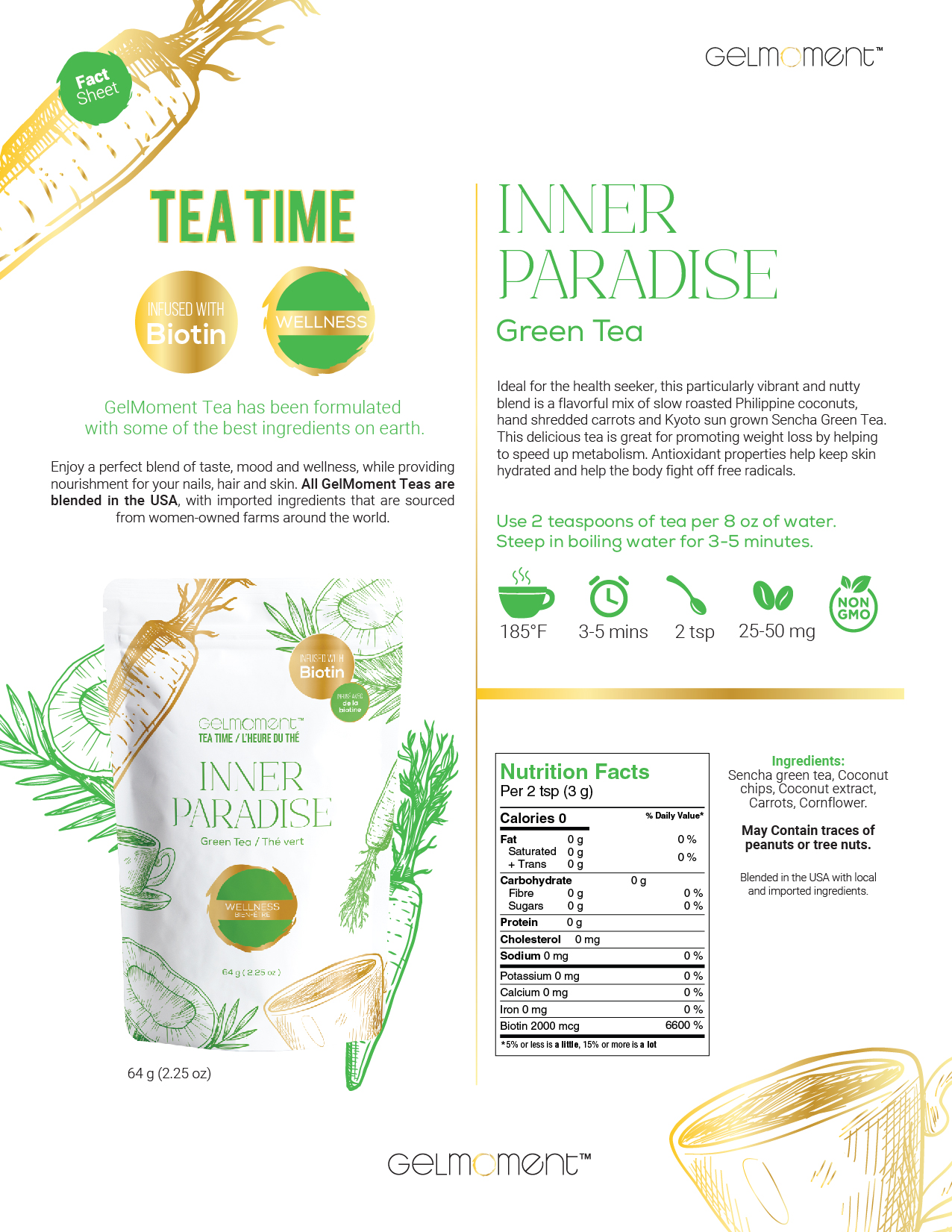 Sencha green tea, coconut chips, coconut extract, carrots, cornflower.