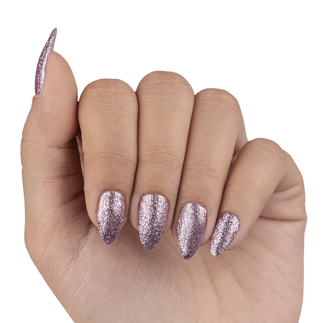 Silver rose. Metallic foil sparkle. Opaque. Cool undertone.