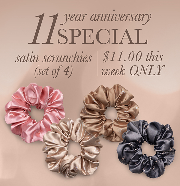 This assorted pack of 4 contains 1 charcoal, 1 pink, 1 rich cream, and 1 golden satin scrunchie.